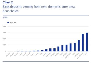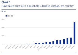 In August 2024 euro area households had a total of around €151 billion in accounts with euro area banks outside their home countries. This corresponds to around 1.6 percent of all household deposits with euro area banks. While this share is small, it represents a significant jump from the figure of €95 billion at the beginning of 2020, which equalled 1.2 percent of all household deposits in the euro area (Chart 1).