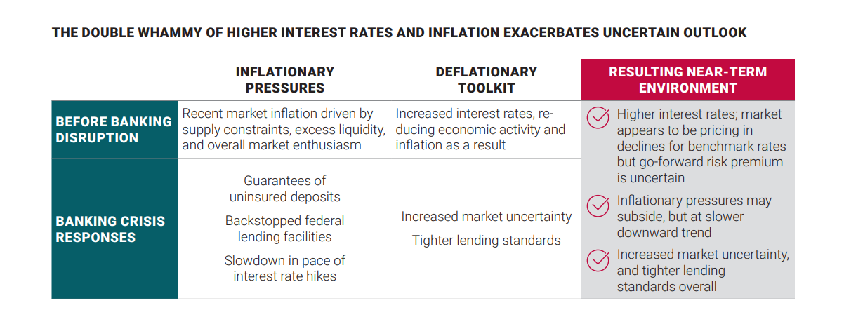 As regulators and markets react to the recent banking disruption, many factors are adding complexity to this equation, even following the recent quarter-point rate hike. Federal guarantees for uninsured deposits, backstops for collateral lending facilities, and an assumed slowdown in the pace of interest rate hikes would, in an academic sense, naturally lead to increased inflationary pressures, counter to the Feds recent efforts to tamp down inflation.