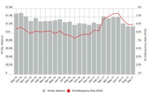 The industrial CMBS delinquency rate came in at 6.55% in September, compared to the delinquency rate of 5.40% for all private-label US CMBS. While it still outpaces the overall reading, the industrial delinquency rate has dropped nearly 100 basis points from 7.57% in June. Like the broader CMBS reading, the industrial delinquency rate has declined in the past three periods. A total of $1.16 billion in industrial CMBS debt was recorded as 30 or more days delinquent last month.