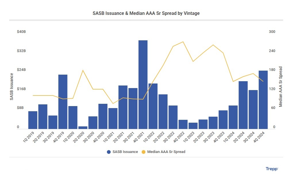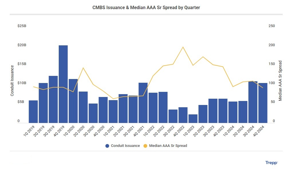Below, we chart the quarterly average AAA CMBS spreads and quarterly total issuance from 2019 through the end of 2024.