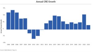 Bank commercial real estate (CRE) lending grew by 3.2% in 2023, significantly slower than the 10.9% growth rate in 2022, according to Federal Reserve data compiled by Trepp.¹ The growth rate in 2023 was the slowest pace since 2012 when the CRE market was still in the throes of the Global Financial Crisis.