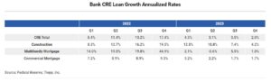 After very strong growth in the second half of 2022, the pace of CRE lending slowed through 2023, beginning with a modest 4.5% annualized growth rate in Q1 and ending with a tepid 2.0% annualized growth rate in Q4.